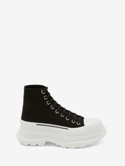 Black canvas lace-up boot with a thick oversized rubber tread sole. The boot is detailed with a textured rubber wrap and tonal Alexander McQueen signature, finished with a signature ribbon on the back of boot. Round toe shape boot silhouette details rubber toe cap