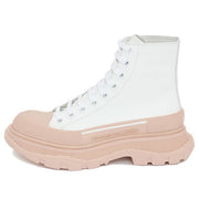 Description: The Alexander McQueen Tread Slick Boot 'White Pink' is a bold and stylish high-top boot that combines a rugged silhouette with feminine touches. Featuring a white canvas upper with soft pink accents, this boot merges utilitarian design with high-fashion elements for a unique and eye-catching look.