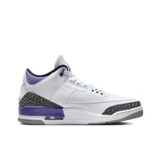 The Jordan 3 Retro "Dark Iris" features a striking combination of color and classic design. The upper is primarily crafted from premium white leather, providing a clean and crisp aesthetic. Dark Iris accents pop on the eyelets, heel tab, and midsole, giving the sneaker a bold look. The signature grey elephant print is featured on the toe and heel, adding texture and depth to the design. With its iconic silhouette and Air cushioning for comfort, the "Dark Iris" seamlessly blends style and performance, making it a must-have for sneaker enthusiasts.